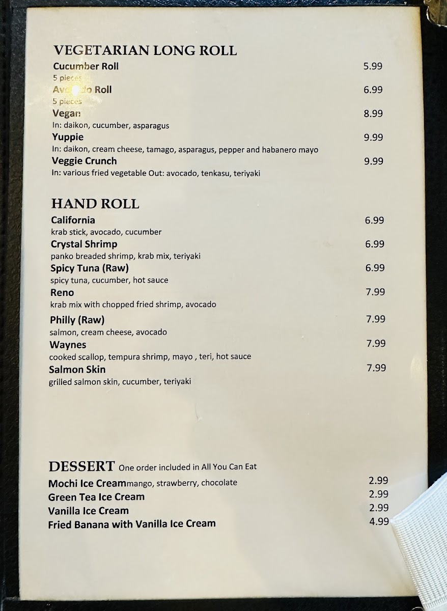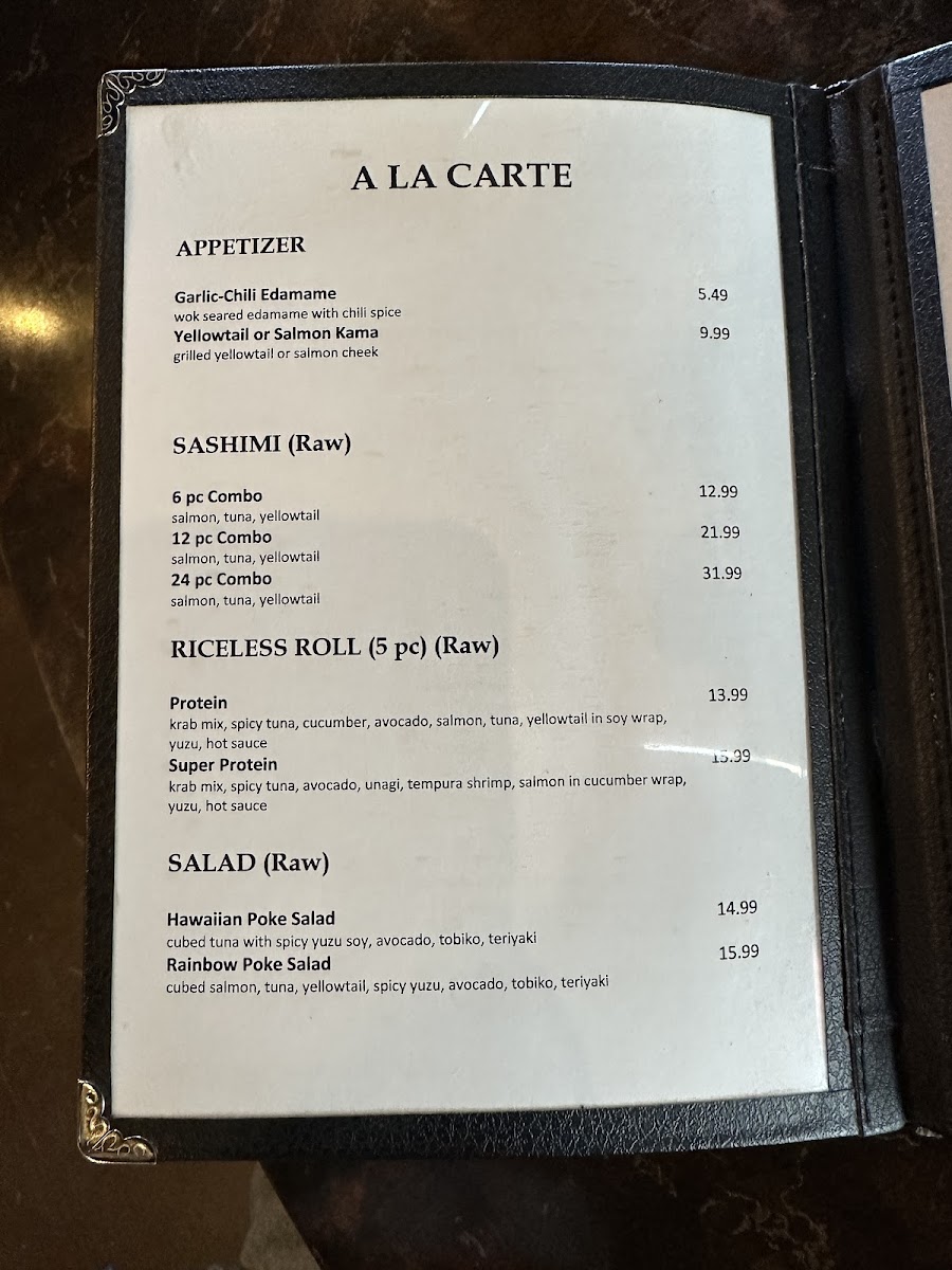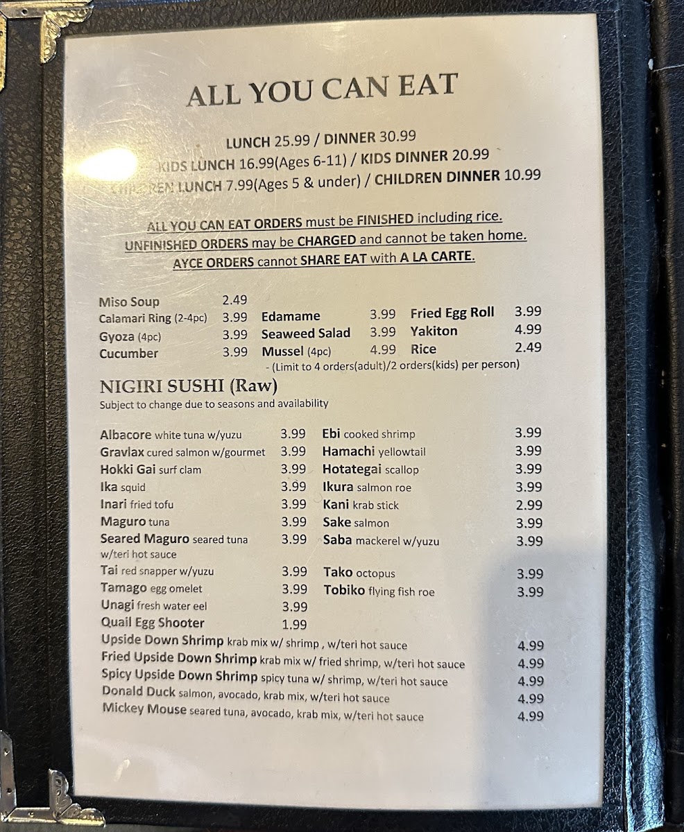 The menu is suitable for casual dining occasions and can accommodate multiple meal preferences, ranging from light bites and appetizers to full meals. Visitors may choose from both à la carte selections and an All You Can Eat Sushi option, allowing for flexible dining experiences.